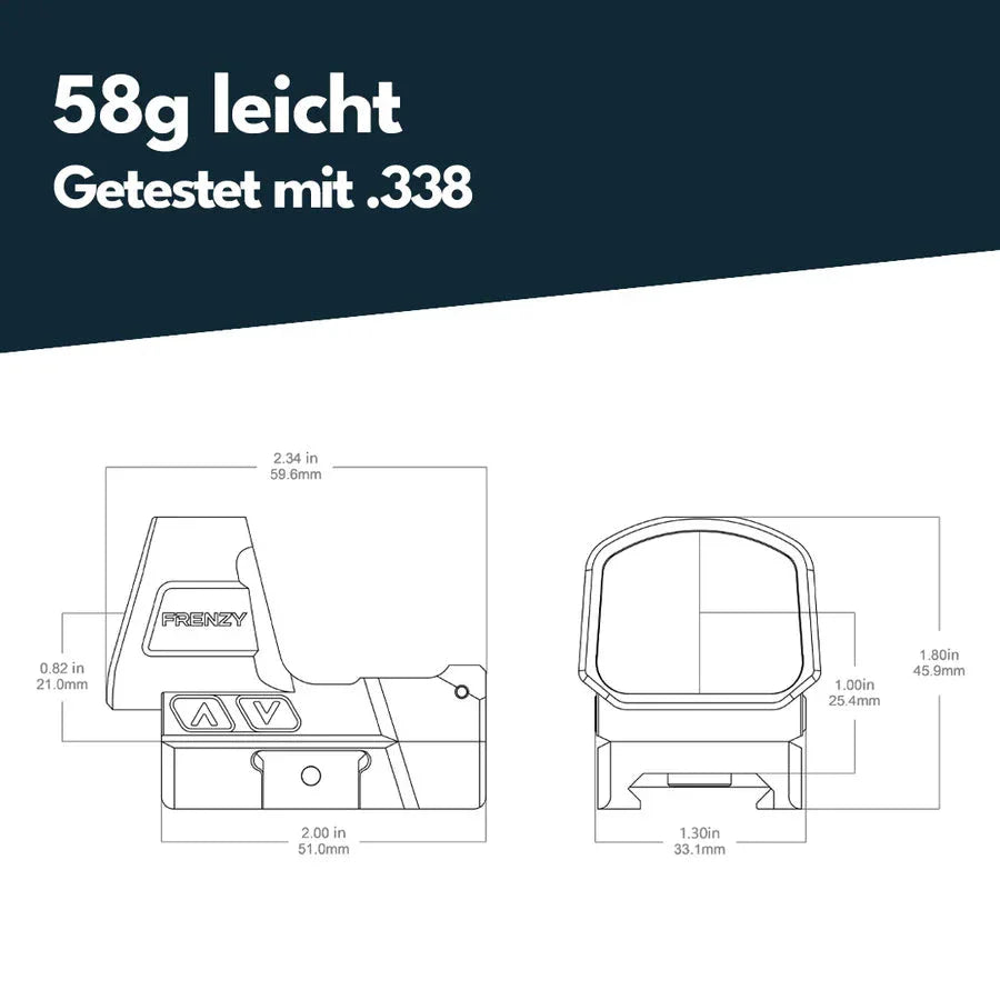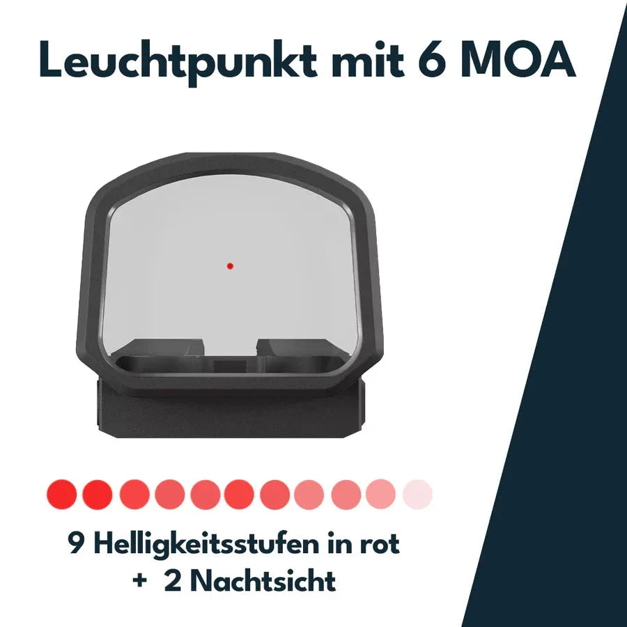 La lente asferica maggiorata con rivestimento ad alte prestazioni offre un campo visivo chiaro per un'acquisizione del bersaglio più rapida dall'estrazione e nelle transizioni da un bersaglio all'altro. Il corpo in lega aeronautica è stato rinforzato ed è stata aggiunta una piastra di base integrata, oltre a un nuovo vano batteria in alluminio per aumentare l'affidabilità nelle applicazioni su carrello.