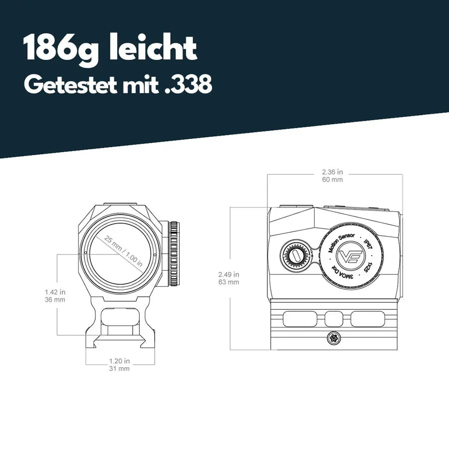 Questa versione si distingue per il design compatto, il peso ridotto e un preciso punto da 3 MOA. Offre inoltre co-witness assoluto (36 mm) e include un sensore di movimento per risparmiare la batteria (spegnimento automatico dopo 2 minuti senza movimento, e si riaccende immediatamente non appena viene spostato).